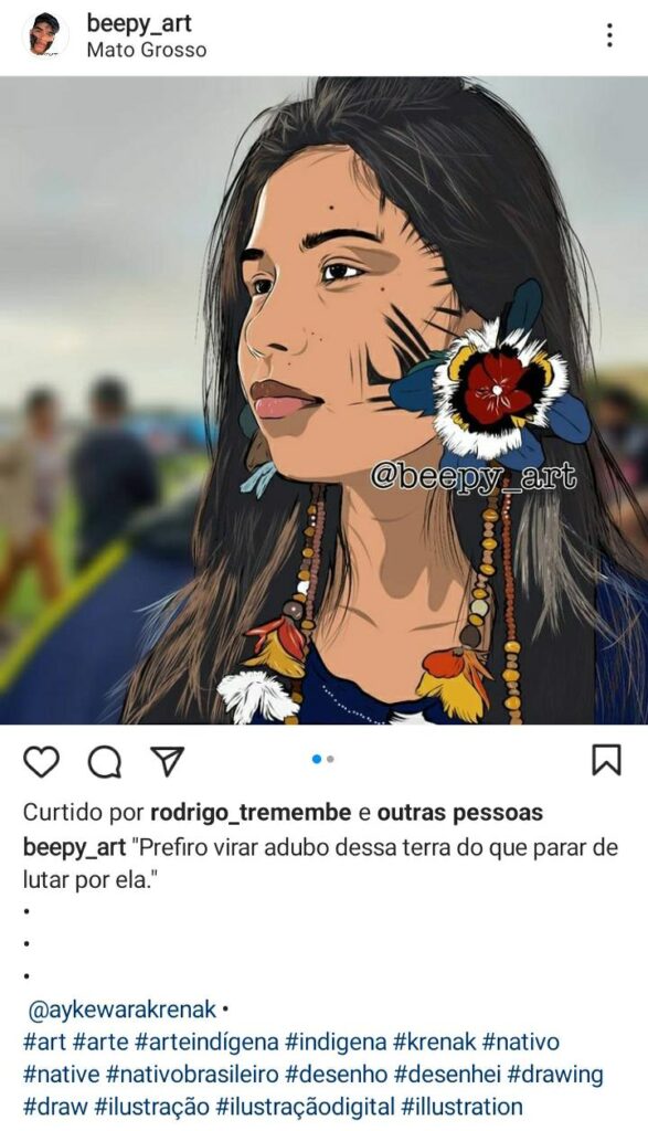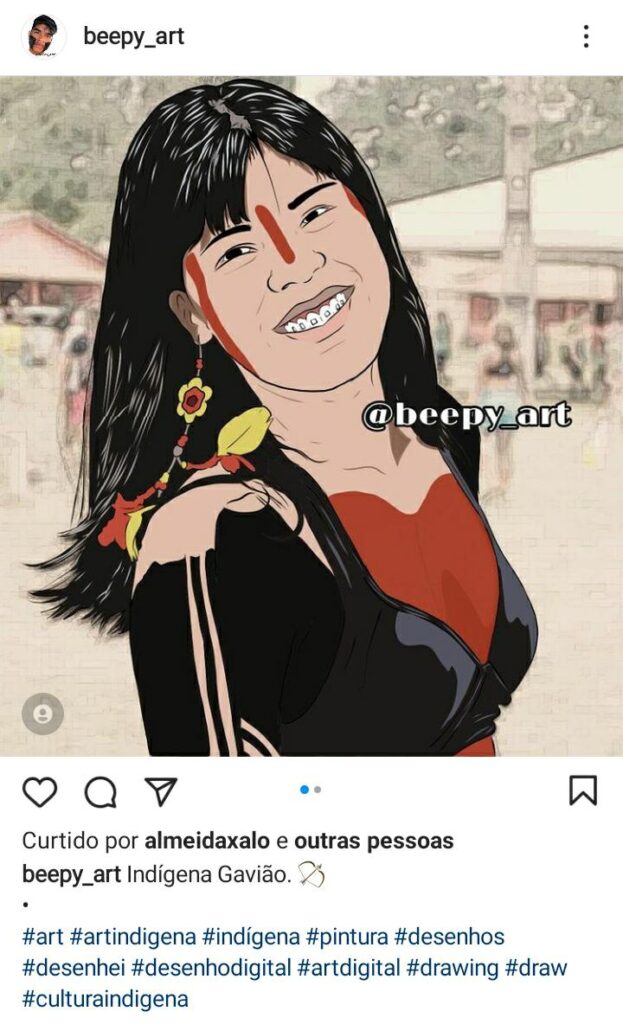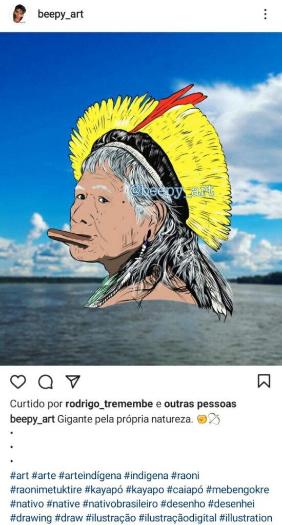 As redes sociais têm sido o meio de divulgação das ilustrações do indígena Kayapó. Em seu Instagram, de nome @beepy_art, o jovem compartilha as artes, como a do cacique Raoni Metuktire, de 89 anos, líder indígena da etnia Kayapó. Confira: