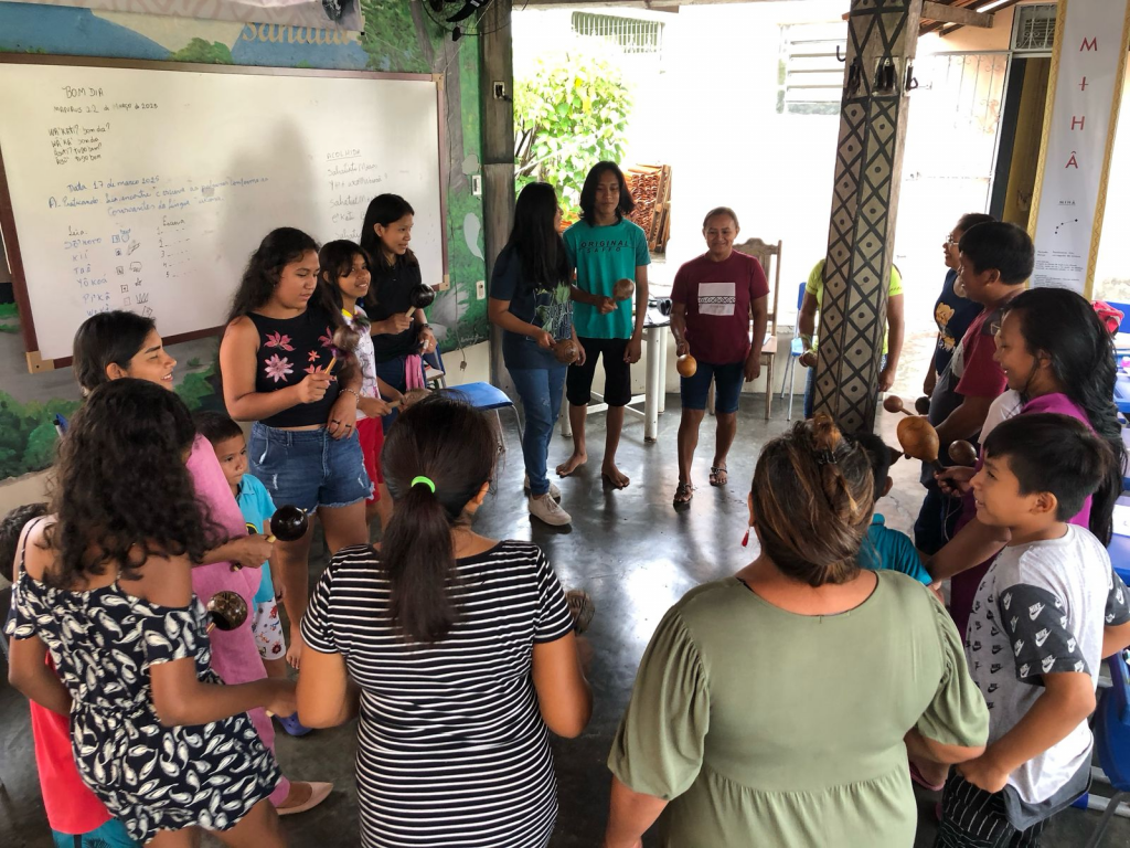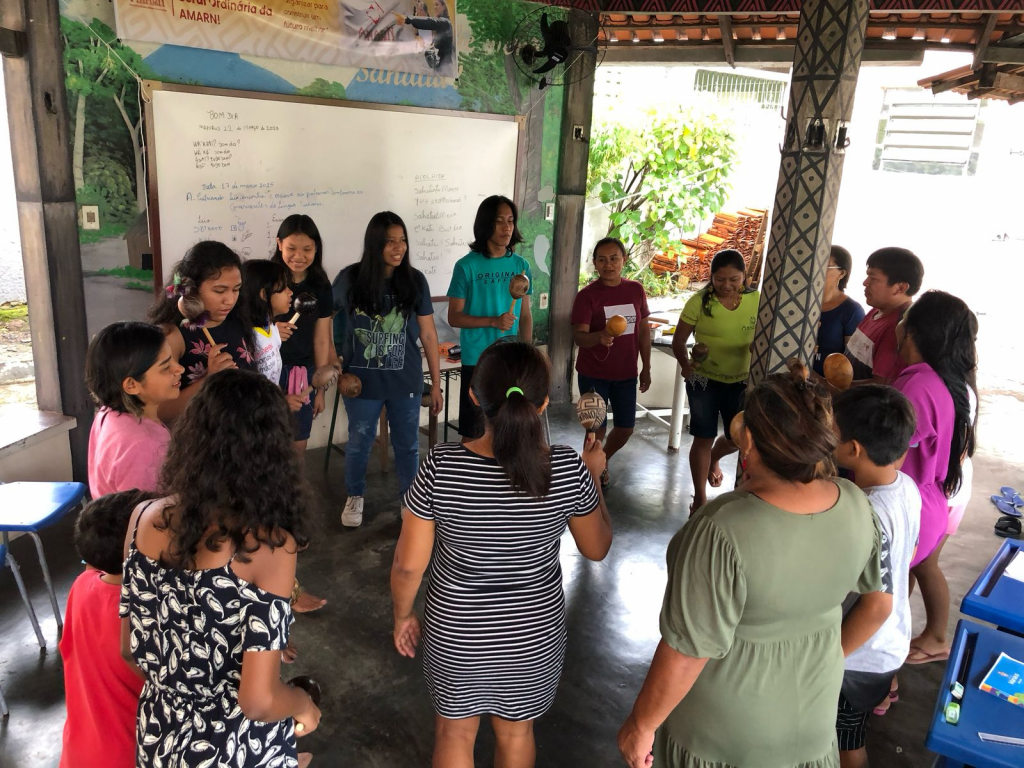 “Eu sou professora indígena no espaço, escolhida pela comunidade. E a gente vem trabalhando com as nossas crianças e os nossos alunos a nossa cultura, a fala, a comida, a dança e os cantos, e repassando o ensinamento para eles. O nome da escola é Bumine, que significa o pássaro que existe no interior. Quando esse passarinho ouve outros passarinhos cantando, ele rapidamente repete o mesmo canto de outro pássaro, ou seja, ele imita. Pensando nisso, nós chegamos a um acordo”, afirmou a professora.