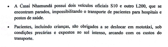 “A Casai Nhamundá possui dois veículos oficiais $ 10 e outro L200, que se encontram parados, impossibilitando o transporte de pacientes para hospitais e postos de saúde. Pacientes, incluindo crianças, são obrigados a se deslocar em mototáxi, sob condições precárias e expostos ao sol intenso, arcando com os custos do transporte”, relatou o documento. Veja um trecho: