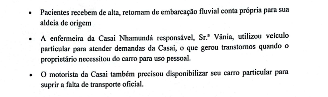 “Pacientes recebem de alta, retornam de embarcação fluvial por conta própria para sua aldeia de origem. A enfermeira responsável da Casai Nhamundá, Srª Vânia, utilizou veículo particular emprestado, para atender demandas da Casai, o que gerou transtornos quando o proprietário necessitou do carro para uso pessoal. Outro caso é do motorista da Casai que também precisou disponibilizar seu carro particular parа suprir a falta de transporte oficial”, diz outro trecho do documento. Veja: