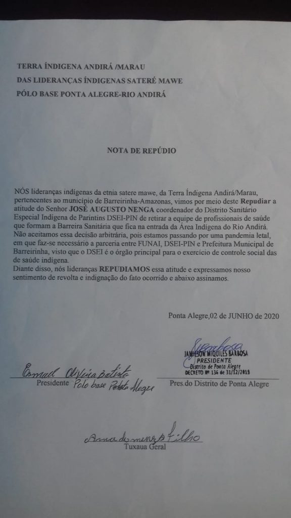 “A Funai está sucateada e não tem sequer como manter o prédio em Parintins que se encontra abandonado, com números de funcionários reduzidos. Agora, imagina como manter esses funcionários na barreira sanitária? Se acontecer de contaminarem o povo Sateré-Mawé, se esse vírus entrar, a responsabilidade recairá sobre a Sesai, que está fazendo de tudo para manter o povo Sateré protegido”, afirmou.