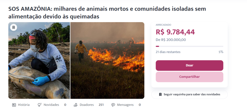 Outra “vaquinha” aberta é a da plataforma VOAA, ligada ao instituto “Razões para Acreditar”. A campanha se chama “SOS AMAZÔNIA: milhares de animais mortos e comunidades isoladas sem alimentação devido às queimadas”. Embora a meta seja arrecadar R$ 200 mil, a 21 dias do fim do prazo, a vaquinha somente R$ 9.784,44.