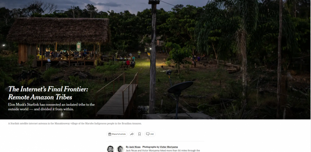 A ação contra o veículo norte-americano aponta que a reportagem, data de junho de 2024, “retratava o povo Marubo como uma comunidade incapaz de lidar com a exposição básica à internet, destacando que os jovens indígenas haviam sido consumidos pela pornografia”. O material é assinado pelo chefe do jornal no Brasil, o jornalista Jack Nicas.