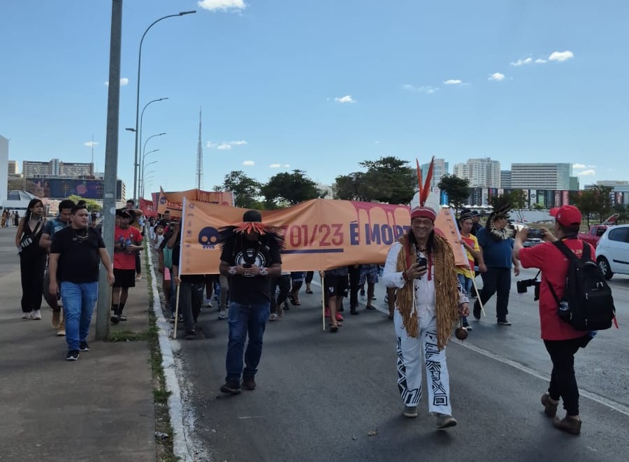 Como parte da mobilização, o grupo foi em passeata até a sede do Supremo Tribunal Federal (STF) para protocolar uma manifestação no âmbito das ações que questionam a inconstitucionalidade da Lei 14.701/2023. No documento, a Apib solicita que sejam suspensos os efeitos dessa lei, porque ela foi a base legal do PDL aprovado pelo Senado, o que trouxe diversos prejuízos aos povos indígenas, com a mudança nos processos de demarcação pelo País.