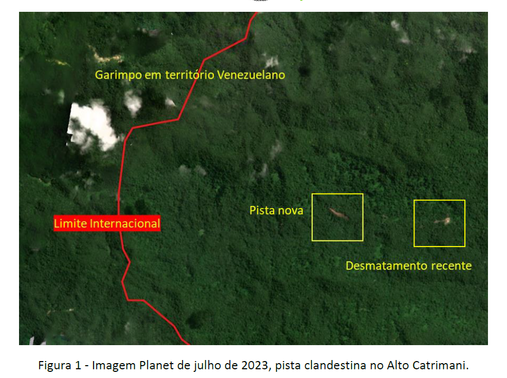 “Nas imagens do mosaico Planet de julho de 2023 foi identificada, por exemplo, a abertura de uma nova pista clandestina na região, nas coordenadas -63,3477; 2,3507, distante 3 km do limite internacional e a pouco mais de 4 km de grandes cicatrizes de garimpo em território venezuelano. No país vizinho, nesta zona, também se observou a construção de uma nova pista de pouso de quase 500 m, que era inexistente até março de 2023“, cita o documento.