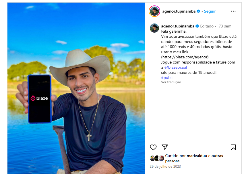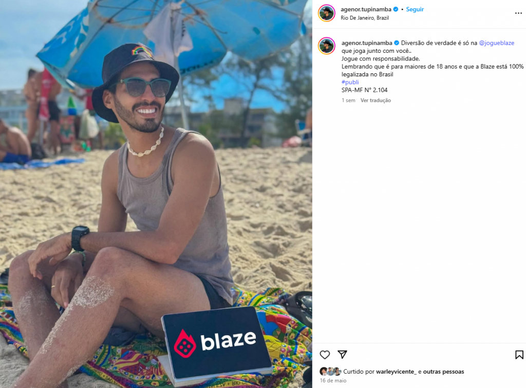 As divulgações reiteradas apontam que o influenciador possui contrato vigente com a plataforma. “Diversão de verdade é só na Blaze, que joga junto com você. Jogue com responsabilidade. Lembrando que é para maiores de 18 anos e que a Blaze está 100% legalizada no Brasil”, menciona Tupinambá na última publicação, que está fixada em seu perfil. Veja: