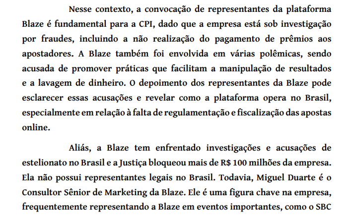 “A convocação de representantes da plataforma Blaze é fundamental para a CPI, dado que a empresa está sob investigação por fraudes, incluindo a não realização do pagamento de prêmios aos apostadores. A Blaze também foi envolvida em várias polêmicas, sendo acusada de promover práticas que facilitam a manipulação de resultados e a lavagem de dinheiro”, disse o parlamentar Izalci Lucas na justificativa.