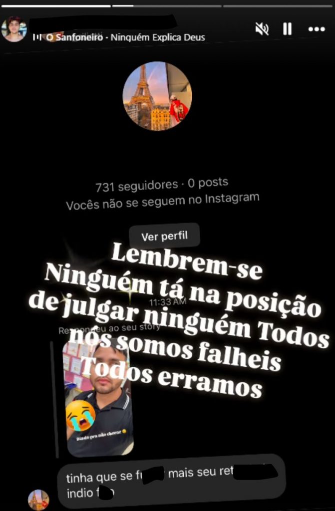 Nessa quinta-feira, o influenciador mostrou um dos ataques que tem recebido nas redes sociais. Em uma das mensagens, enviada na plataforma Instagram, ele é xingado e chamado de “índio“. “Lembrem-se: ninguém tá na posição de julgar ninguém. Todos nós somos falheis [sic]. Todos erramos“, disse Mady Guerreiro.