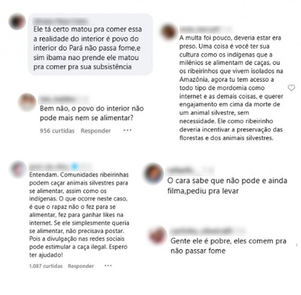 “Entendam. Comunidades ribeirinhas podem caçar animais silvestres para se alimentar, assim como os indígenas. O que ocorre neste caso, é que o rapaz não o fez para se alimentar, fez para ganhar likes na internet. Se ele simplesmente queria se alimentar, não precisava postar. Pois a divulgação nas redes sociais pode estimular a caça ilegal. Espero ter ajudado!“, afirmou outra internauta.