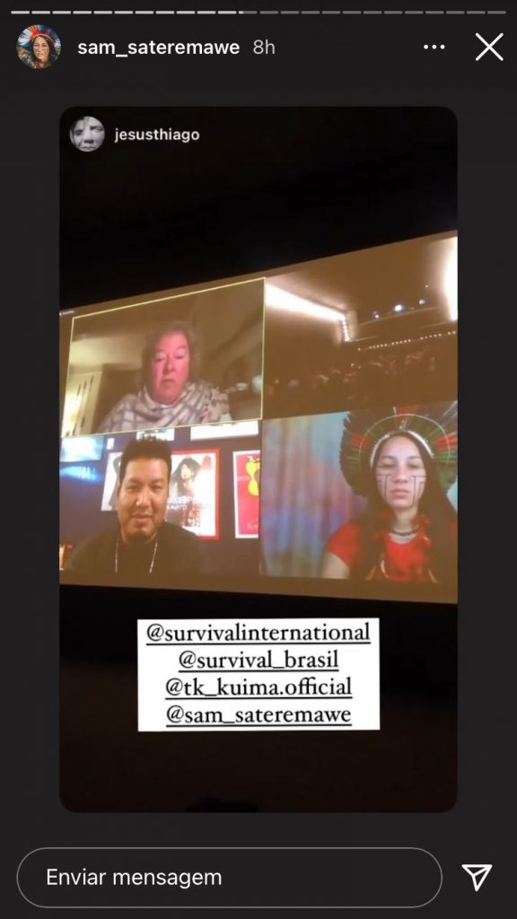 Neste sábado, 23, a ativista compartilhou os bastidores do evento, onde ela aparece em um telão exibido no auditório do Instituto de Artes Contemporâneas (ICA) de Londres, em conversa com o cineasta Takumã Kuikuro e representantes de Organizações Não-Governamentais (ONGs).