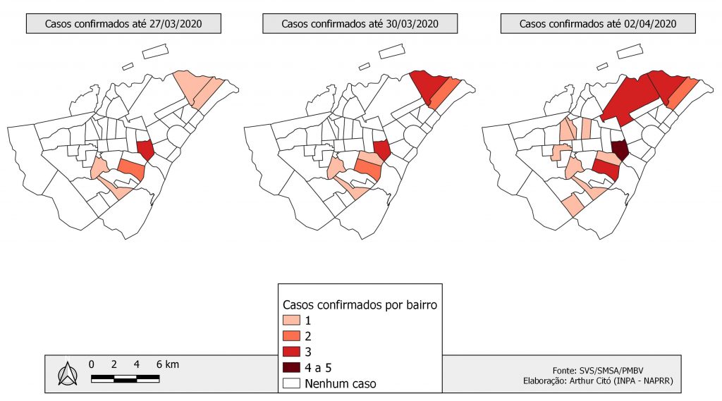 Os mapas auxiliam a SVS na visualização da distribuição dos casos e sua evolução quantitativa no município de Boa Vista. As informações podem servir no planejamento de ações de prevenção e controle à covid-19, além de distribuição e uso de recursos humanos, materiais e de equipamentos. “Não há nenhuma ação de campo do Inpa, nosso trabalho é todo no laboratório”, explicou Citó.