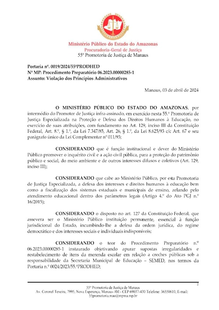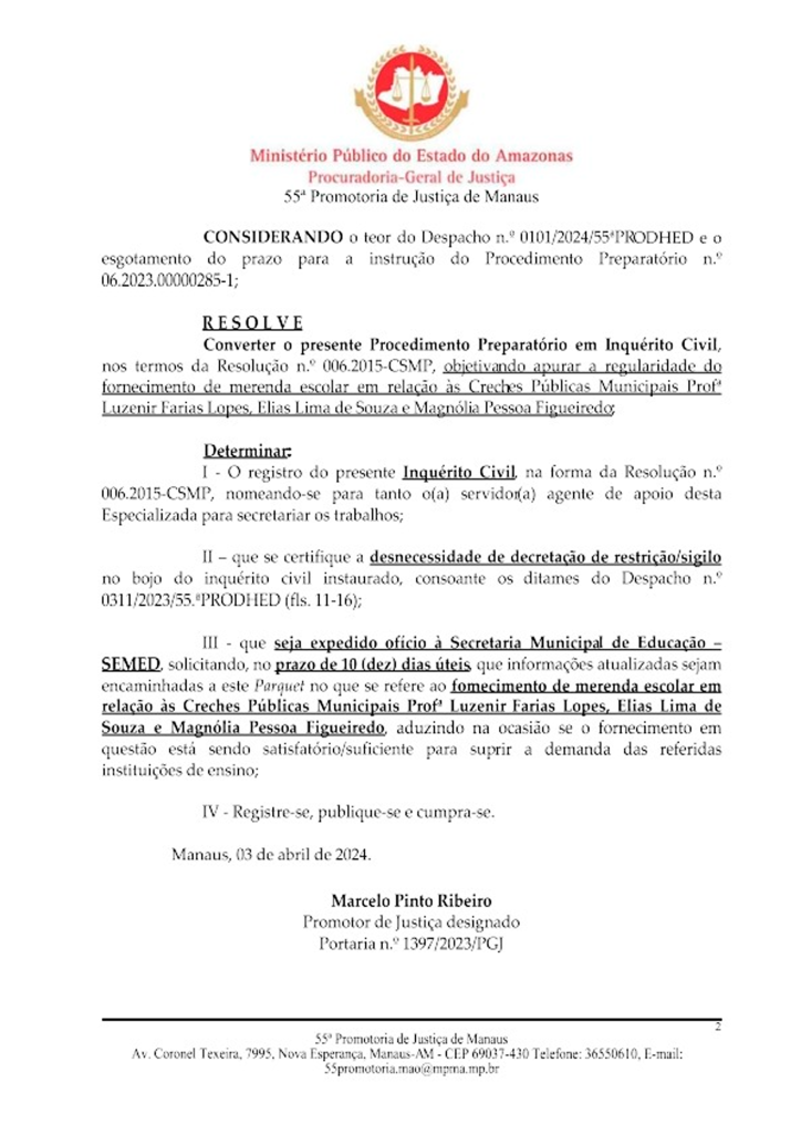 A portaria de renovação foi publicada no Diário Oficial do MP-AM em 18 de março, assinada pelo promotor de Justiça Marcelo Pinto Ribeiro, considerando o vencimento do prazo de tramitação do procedimento instaurado para apurar suposto descumprimento dos direitos de alunos com deficiência nas escolas municipais.