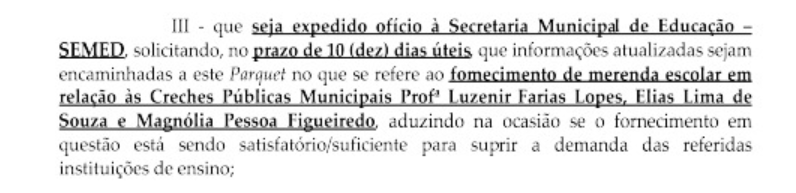 “Que seja expedido ofício à Semed, solicitando, no prazo de 10 (dez) dias úteis, que informações atualizadas sejam encaminhadas a este Parquet no que se refere ao fornecimento de merenda escolar nas creches públicas municipais Profª Luzenir Farias Lopes, Elias Lima de Souza e Magnólia Pessoa Figueiredo, aduzindo na ocasião se o fornecimento em questão está sendo satisfatório/suficiente para suprir a demanda das referidas instituições de ensino”, elenca Ribeiro.