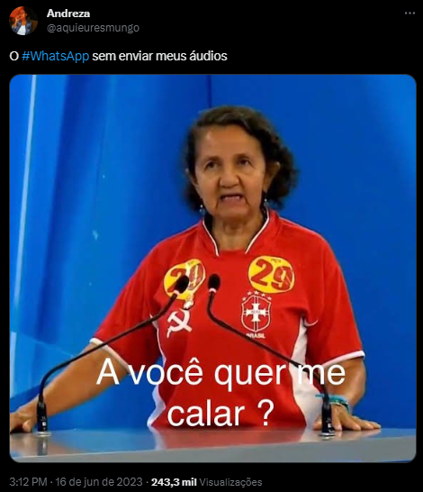 A usuária usou o bordão “Você quer me calar?” para relatar que não conseguia enviar áudios pelo WhatsApp. O tuíte recebeu mais de 243 mil visualizações e continua contando.