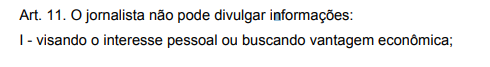 No Jornalismo, assim como em qualquer área ou atividade profissional, há questões éticas que devem ser seguidas. Desde 1949, o Código de Ética do Jornalismo no Brasil estabelece diretrizes e auxilia o jornalista no exercício da profissão, entre elas, o artigo 11, que diz que o jornalista deve evitar a divulgação dos fatos com o interesse de favorecimento pessoal ou vantagens econômicas.