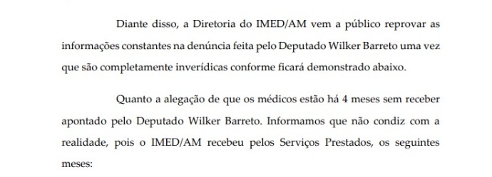 “A Diretoria do IMED/AM vem a público reprovar as informações constantes na denúncia feita pelo deputado Wilker Barreto, uma vez que são completamente inverídicas, quanto à alegação de que os médicos estão há 4 meses sem receber, apontada pelo deputado Wilker Barreto. Informamos que não condiz com a realidade, pois o IMED/AM recebeu pelos Serviços Prestados”, destaca a nota.