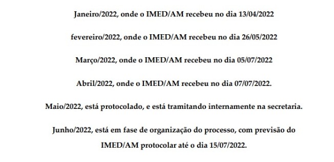 O documento acrescenta ainda que a Secretaria de Saúde do Estado do Amazonas (SES-AM) sempre se mostrou aberta para reuniões e para sanar as dúvidas quanto às previsões de pagamentos. Na última reunião, que ocorreu na segunda-feira, 4, com o secretário de Saúde Dr. Anoar Samad, ficou previsto o pagamento do mês de março/2022 no dia 05/07/22, bem como o pagamento do mês de abril/2022 no dia 07/07/22, quinta-feira, o que de fato ocorreu.