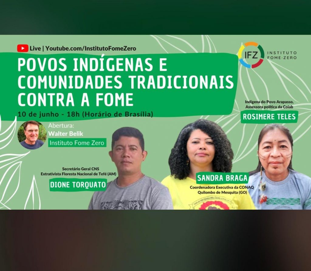 A live vai contar com a participação de pessoas ligadas aos movimentos indígenas. Nomes como o do secretário-geral do Conselho Nacional das Populações Extrativistas, Dione Torquato, e a indígena do Povo Arapasso e assessora política da Coordenação das Organizações Indígenas da Amazônia Brasileira (Coiab), Rosimere Teles, são presenças confirmadas no evento que visa debater os desafios das populações indígenas, extrativistas e quilombolas no combate à fome.