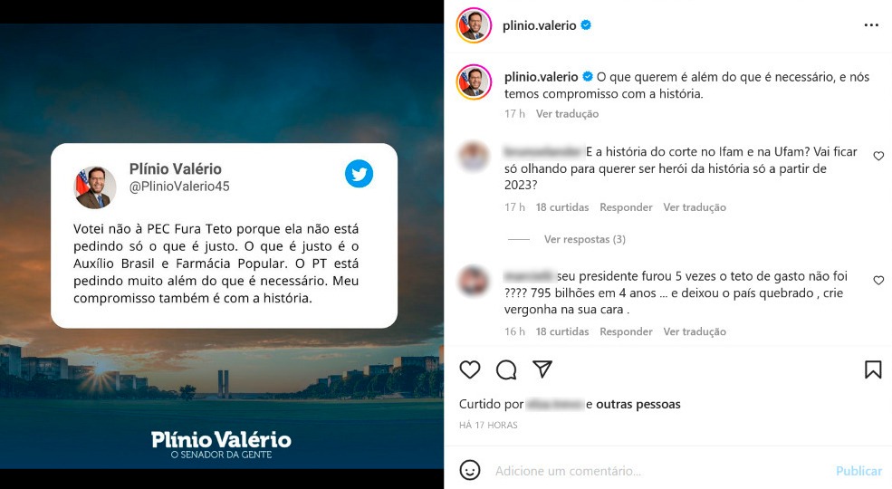 “E a história do corte no Ifam e na Ufam? Vai ficar só olhando para querer ser herói da história só a partir de 2023?”, questionou um usuário do Instagram em publicação na rede oficial do senador onde explica porque votou contra a PEC. “Ufam sem recursos porque Bolsonaro tirou dinheiro da Educação”, escreveu outra internauta.