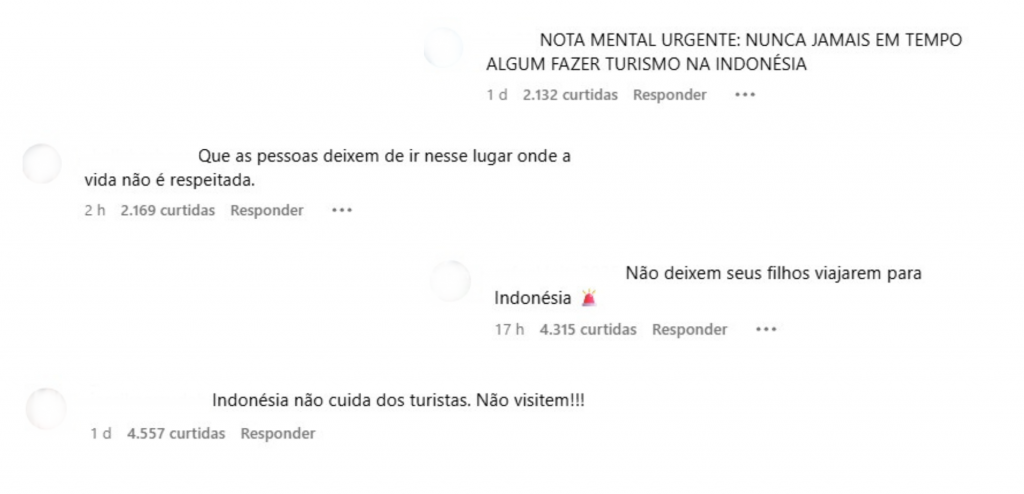 “Indonésia não cuida dos turistas. Não visitem!“, afirmou uma brasileira. “Nota mental urgente: nunca, jamais, em tempo algum, fazer turismo na Indonésia“, comentou outra pessoa.