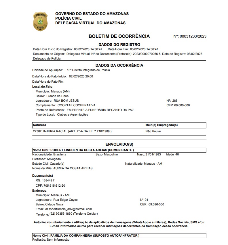 Ao final, as partes entraram em entendimento e Herbert Cardoso pôde se despedir da companheira de acordo com os ritos de sua religião. “Após duas horas de muita conversa com várias explicações sobre os efeitos da Lei N° 14.532/23, assinada pelo presidente Lula, que mudou a legislação brasileira em favor de quem sofre crime de injúria racial (e ofensas religiosas), os familiares mais exaltados demonstraram entender as implicações e punições das Leis N° 7.716/89 e N° 14.532/23”, finalizou. Cláudia Marcela Alves Bandeira foi sepultada na tarde deste sábado, 4.