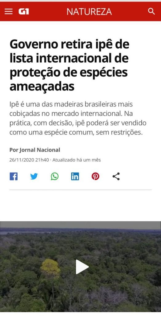 No final de novembro, o governo Bolsonaro retirou o ipê de uma lista internacional de proteção de espécies ameaçadas. Por causa da crescente exploração e venda ilegal, o ipê estava em uma lista de espécies ameaçadas da convenção sobre o comércio internacional de espécies da fauna e da flora selvagem.