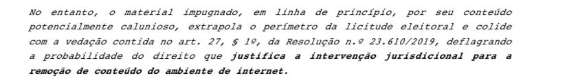 O juiz considera ainda o potencial calunioso da inverdade disseminada por aplicativo de mensagens: “O material impugnado, em linha de princípio, por seu conteúdo potencialmente calunioso, extrapola o perímetro da licitude eleitoral e colide com a vedação contida no art. 27, § 1o, da Resolução n.o 23.610/2019, deflagrando a probabilidade do direito que justifica a intervenção jurisdicional para a remoção de conteúdo do ambiente de internet”.
