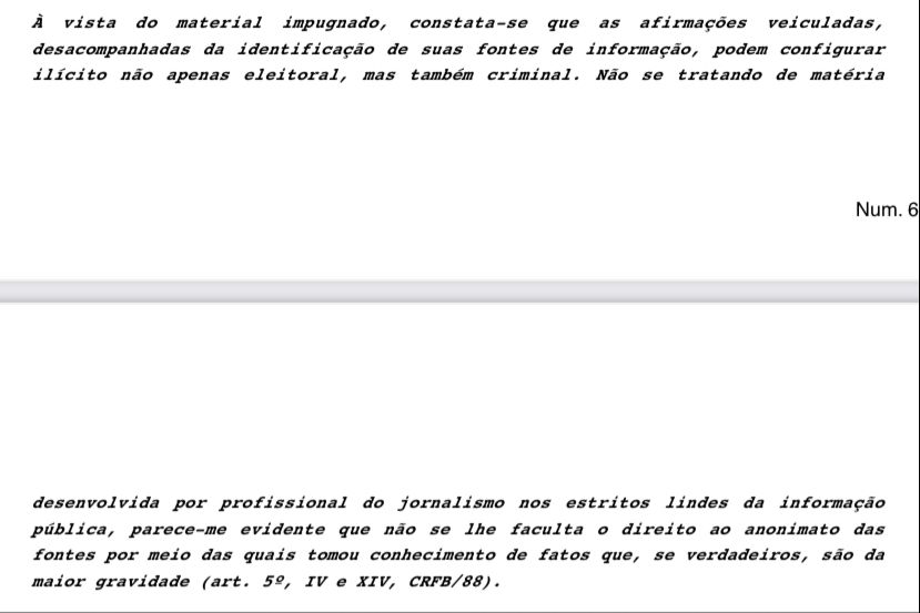 “À vista do material impugnado, constata-se que as afirmações veiculadas, desacompanhadas da identificação de suas fontes de informação, podem configurar ilícito não apenas eleitoral, mas também criminal. Não se tratando de matéria desenvolvida por profissional do jornalismo nos estritos lindes da informação pública, parece-me evidente que não se lhe faculta o direito ao anonimato das fontes por meio das quais tomou conhecimento de fatos que, se verdadeiros, são da maior gravidade (art. 5o, IV e XIV, CRFB/88)”, sentencia o magistrado em sua decisão.