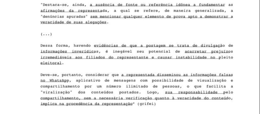 “Deve-se, portanto, considerar que a representada disseminou as informações falsas no WhatsApp, aplicativo de mensagens com possibilidade de visualização e compartilhamento por um número ilimitado de pessoas, o que facilita a ‘viralização’ dos conteúdos postados. Logo, sua responsabilidade pelo compartilhamento, sem a necessária verificação quanto à veracidade do conteúdo, implica na procedência da representação”, classificou o magistrado.