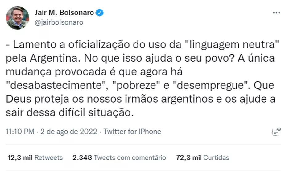 “Lamento a oficialização do uso da “linguagem neutra” pela Argentina. No que isso ajuda o seu povo? A única mudança provocada é que, agora, há ‘desabastecimente’, ‘pobreze’ e ‘desempregue’. Que Deus proteja os nossos irmãos argentinos e os ajude a sair dessa difícil situação”, compartilhou Bolsonaro em seu perfil no Twitter.