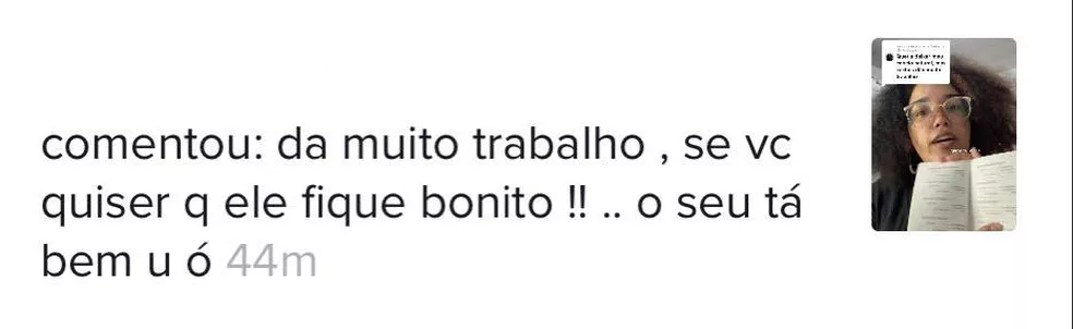 “Na época da transição, minha melhor amiga não tinha gostado e falava “preferia liso”, porém, eu sempre me importei mais com o que eu mesma acho. A galera que já me segue, normalmente, elogia. Mas quando algum vídeo viraliza e vai para novas pessoas, aparecem comentários questionando algo. Desde que se dá trabalho até quais produtos eu uso. Eu me sinto desconfortável, às vezes, quando são perguntas tipo “você consegue desembaraçar?”, pois, dá a sensação de que é um tipo de cabelo muito diferente e exótico”, afirma.
