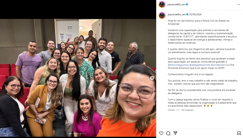 MANAUS (AM) – A delegada Joyce Coelho afirmou, em publicação na rede social Instagram, que foi surpreendida com a portaria que a designa à Delegacia Especializada em Apuração de Atos Infracionais (Deaai). A autoridade policial estava à frente da Delegacia Especializada em Proteção à Criança e ao Adolescente (Depca).