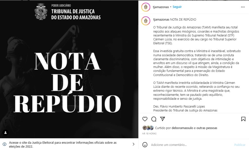 As manifestações das instituições ocorreram também por meio das redes. O Tribunal de Justiça do Amazonas (TJ-AM) publicou nota assinada pelo presidente, o desembargador Flávio Pascarelli, chamando as alegações do ex-deputado de “ataques misóginos, covardes e machistas“.