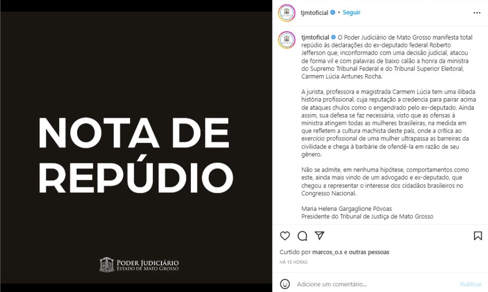 No Estado do Mato Grosso, a presidente do Tribunal de Justiça do Estado, Maria Helena Gargaglione Póvoas, afirmou que Jefferson atacou a honra de Cármen Lúcia de “forma vil e com palavras de baixo calão“, pontuando ainda que as ofensas refletem a cultura machista do País e atingem todas as mulheres.
