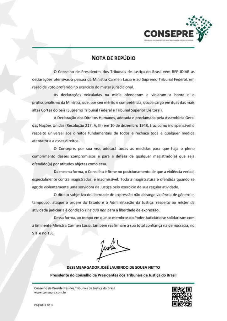 Representando os tribunais de Justiça do País, o Conselho de Presidentes dos Tribunais de Justiça do Brasil (Consepre) também divulgou nota de repúdio em relação aos ataques, dando destaque à Declaração dos Direitos Humanos defende o respeito universal aos direitos fundamentais de todos os cidadãos, e rechaça ameaças a esses direitos.