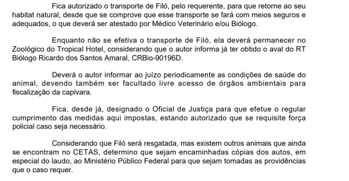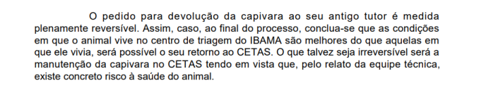 O magistrado afirmou que a devolução da capivara ao seu antigo tutor pode ser revertida caso, ao final do processo, seja concluído que as condições do Cetas são melhores do que as que Filó vivia, mas que a saúde do animal, por ora, está ameaçada se permanecer no centro do Ibama. “O que talvez seja irreversível será manutenção da capivara no Cetas tendo em vista que, pelo relato da equipe técnica, existe concreto risco à saúde do animal”, afirmou o juiz.