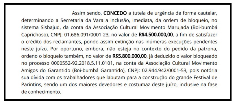 “Assim sendo, concedo a tutela de urgência, de forma cautelar, determinando a secretaria da Vara à inclusão, imediata, da ordem de bloqueio, no sistema Sisbajud, da conta da Associação Cultural Movimento Marujada (Boi-Bumbá Caprichoso), (…) no valor de R$ 4.500.000,00, a fim de satisfazer o crédito dos reclamantes, pondo assim, extinção nas inúmeras execuções pendentes neste juízo”, consta em um trecho da decisão.