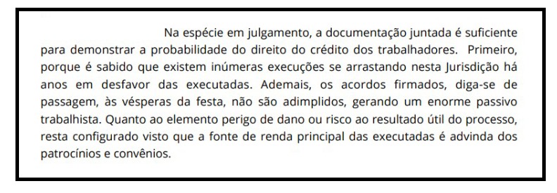 Por oportuno, embora, não esteja no contexto do pedido da patrona, ordeno o bloqueio também, no valor de R$ 5.800.000,00, (…) na conta da Associação Cultural Movimento Amigos do Garantido (Boi-Bumbá Garantido), (…), pois, notória sua dívida com os trabalhadores que labutam para a construção do grande Festival de Parintins, sendo um dos maiores devedores e costumaz deste juízo, inclusive na fase de conhecimento”, disse.