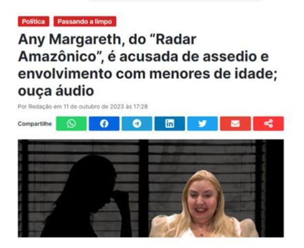 Da mesma forma, por se tratar de assédio envolvendo um menor de idade, e caso a denúncia fosse verdadeira, Cileide Moussallem sequer encaminhou o caso do suposto assédio para as autoridades, extrapolando a “liberdade de expressão de imprensa“, visando ofender a imagem da dona do Radar Amazônico, Any Margareth.