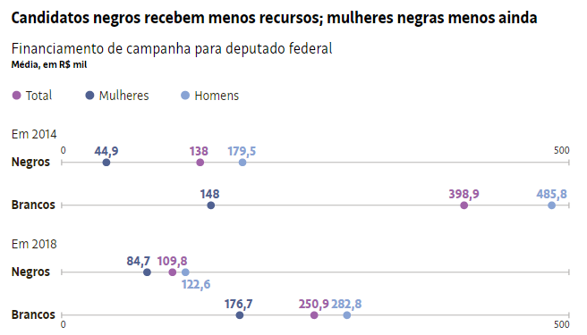 De acordo com especialistas, o financiamento eleitoral de mulheres e pessoas negras é um dos principais gargalos para essas candidaturas, ajudando a explicar, por exemplo, por que candidatos brancos têm pelo menos o dobro de chance de se eleger em relação a candidatos negros.