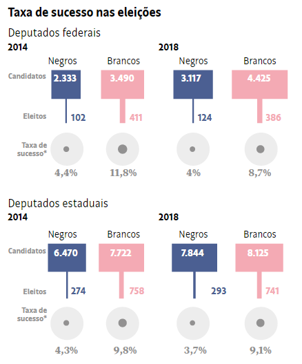 A distorção a que ele se refere é evidente. Na Câmara dos Deputados, por exemplo, entre os 513 parlamentares eleitos em 2018, há 124 registrados como negros, classificação que inclui pretos e pardos. Ou seja, pouco menos de 25%, embora os negros sejam mais de metade da população brasileira.