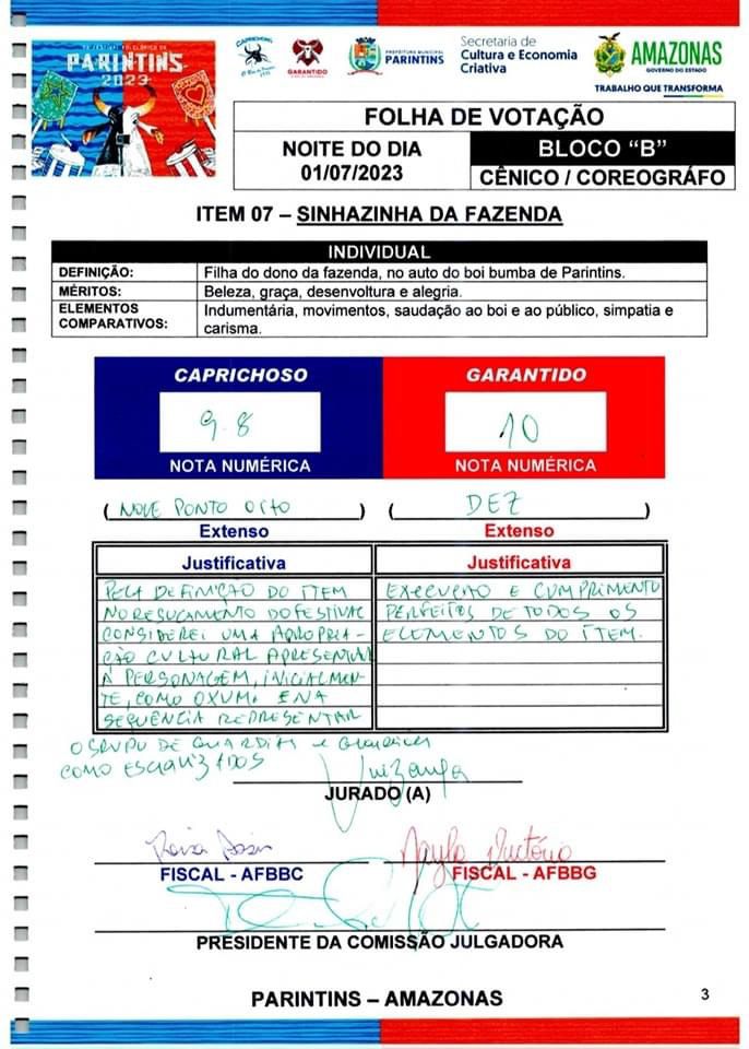 A observação de Luciana Santos se assemelha à justificativa da nota 9,5 atribuída ao item pelo jurado Marco Aurélio da Cruz Souza, doutor e mestre em Dança pela Universidade de Lisboa, em Portugal. O avaliador disse ter estranhado o contexto apresentado pelo bumbá, o que causou, para ele, “impressão negativa de apropriação cultural”.