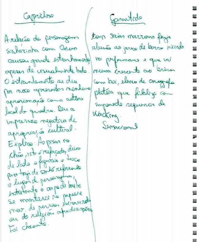 O jurado continua: “Ao pisar no chão, isto é, reforçado, deixa de lado o figurino e troca para o traje de sinhá, reforçando o lugar de personagem. Entretanto, o corpo de baile se manteve no papel de pessoas escravizadas ou de religião afrodispórica. Foi chocante”, escreveu.