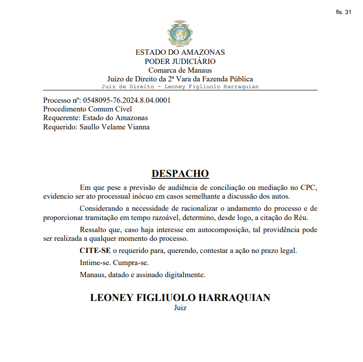 Em despacho publicado nessa quarta-feira, 21, o juiz Leoney Figliuolo Harraquian, da 2ª Vara da Fazenda Pública do Amazonas, citou Saullo Vianna como parte do processo, uma formalidade essencial para a validade do litígio. A partir deste momento, o parlamentar pode defender-se dentro dos prazos legais estipulados no processo.