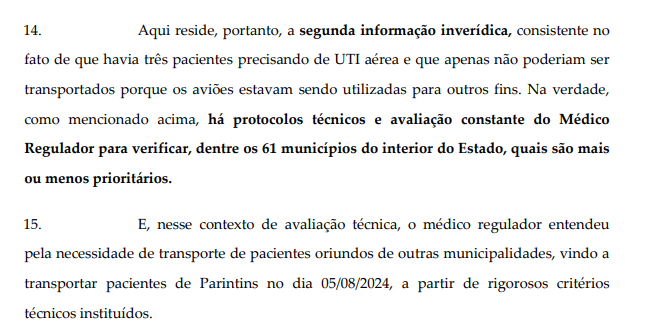 “(…) há protocolos técnicos e avaliação constante do Médico Regulador para verificar, dentre os 61 municípios do interior do Estado, quais são mais ou menos prioritários. E, nesse contexto de avaliação técnica, o médico regulador entendeu pela necessidade de transporte de pacientes oriundos de outras municipalidades, vindo a transportar pacientes de Parintins no dia 05/08/2024, a partir de rigorosos critérios técnicos instituídos“, explicou a PGE.