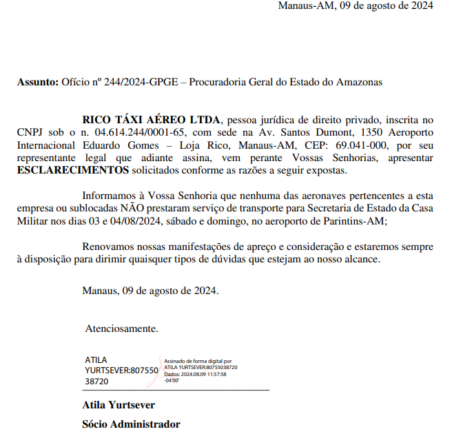 “No tocante às aeronaves do Estado do Amazonas, conforme documentos anexados ao final da presente exordial, a Secretaria de Estado da Casa Militar confirmou que não houve nenhuma aeronave locada ou sublocada pelo governo do Estado do Amazonas, não tendo realizado nenhum voo nos dias 3 e 4 de agosto de 2024 no aeroporto de Parintins/AM“, diz a declaração da PGE no processo, com os documentos anexados da empresa Rico Taxi Aéreo.