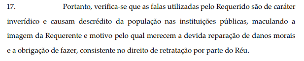 “Portanto, verifica-se que as falas utilizadas pelo requerido são de caráter inverídico e causam descrédito da população nas instituições públicas, maculando a imagem da requerente e motivo pelo qual merecem a devida reparação de danos morais e a obrigação de fazer, consistente no direito de retratação por parte do réu”, declarou a PGE.
