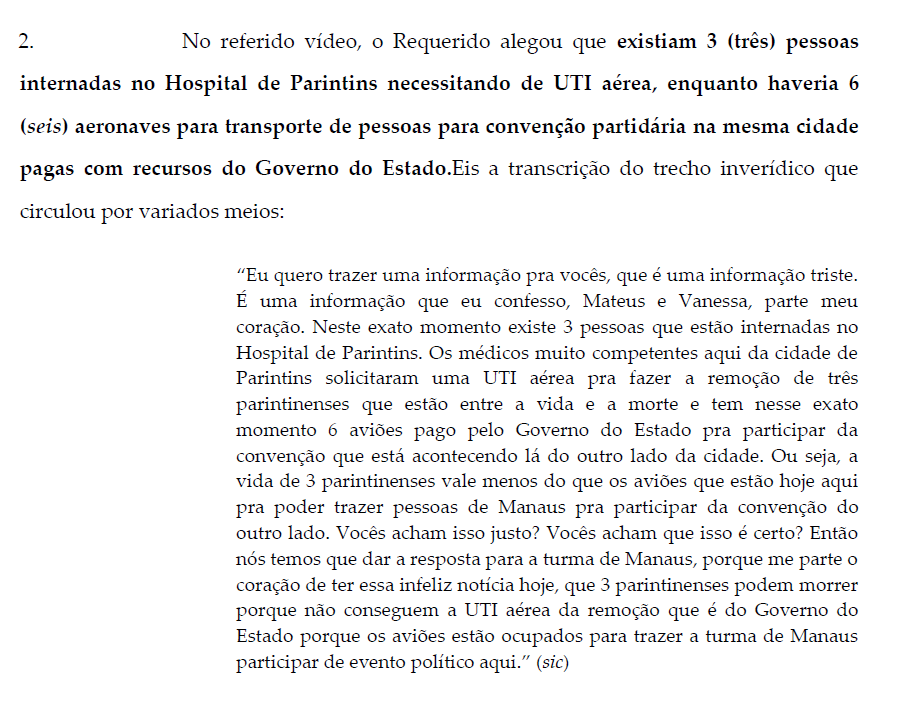 Conforme consta nos documentos aos quais a CENARIUM teve acesso, Saullo Vianna declarou na convenção do Partido Social Democrático (PSD) em Parintins — onde foi confirmado Mateus Assayag como candidato à prefeitura da cidade pela sigla —, que havia três pessoas internadas no Hospital Regional Dr. Jofre de Matos Cohen necessitando de UTI aérea enquanto haveria seis aeronaves direcionadas ao transporte de pessoas para outra convenção partidária na mesma cidade, supostamente pagas com recursos do governo do Estado.