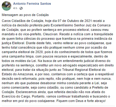 “Na busca de um entendimento judicial diverso do proferido na sentença, constitui um novo advogado especializado em direito eleitoral para tratar da situação junto ao Tribunal Regional Eleitoral do Estado do Amazonas e, por isso, contamos com a certeza que a respeitável decisão será reformada, pois, repito, não pratiquei, nem hoje e nem nunca, nenhum ato que pudesse desabonar minha conduta perante a Lei, seja como comerciante, seja como cidadão, ou como candidato a prefeito de Codajás”, escreveu Antônio.