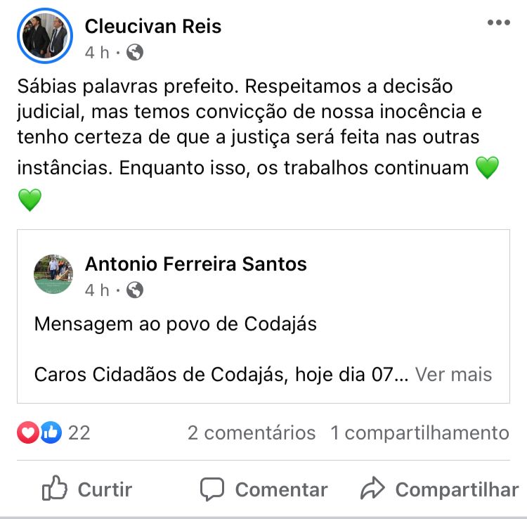 O vice-prefeito Cleucivan, ao compartilhar a publicação do chefe do executivo municipal, disse que respeita a decisão judicial, mas tem convicção da inocência dele e dos demais réus. “Respeitamos a decisão judicial, mas temos convicção de nossa inocência e tenho certeza de que a Justiça será feita nas outras instâncias. Enquanto isso, os trabalhos continuam”, publicou Cleucivan.